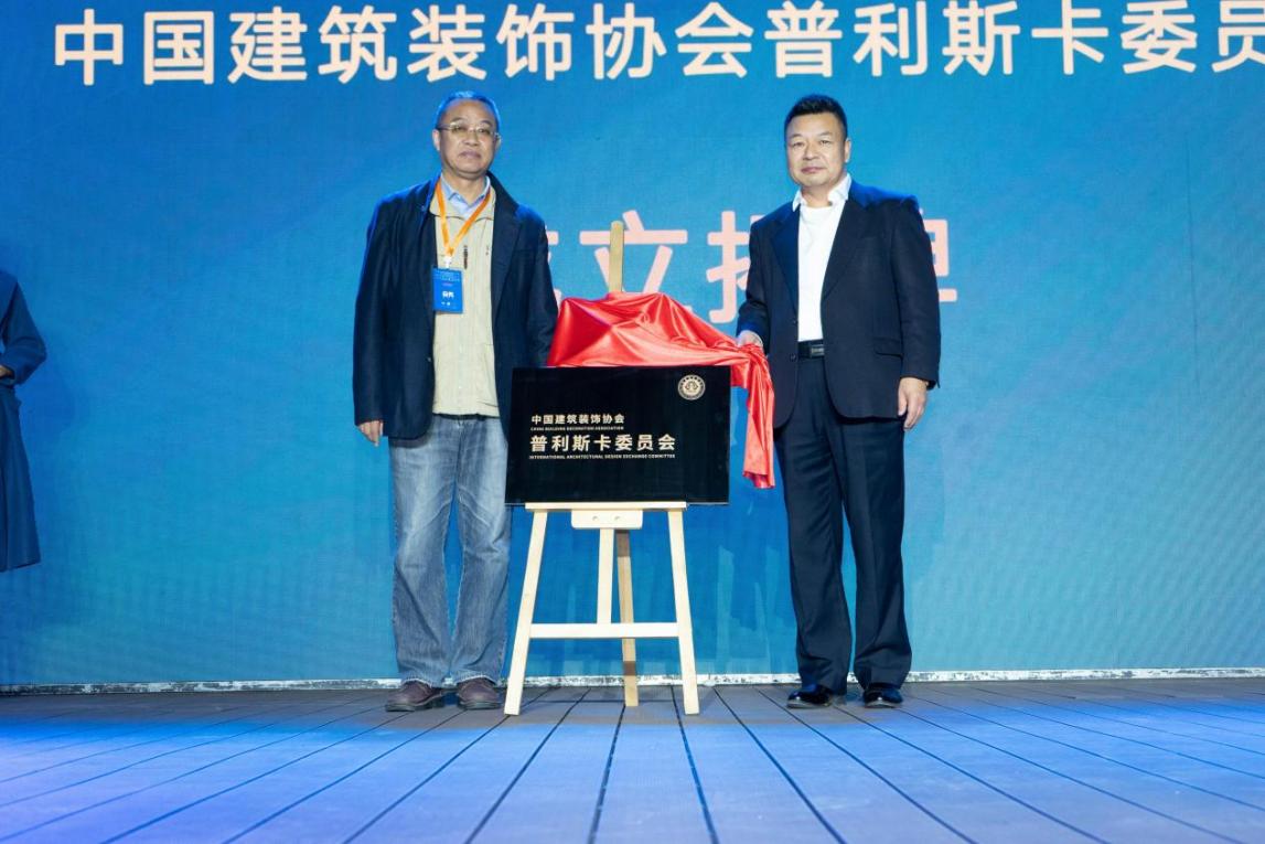 中国建筑装饰协会副秘书长刘原,辽宁杰生活实业集团董事长、中国建筑装饰协会普利斯卡委员会秘书长荣华民共同为中国建筑装饰协会普利斯卡委员会揭牌。