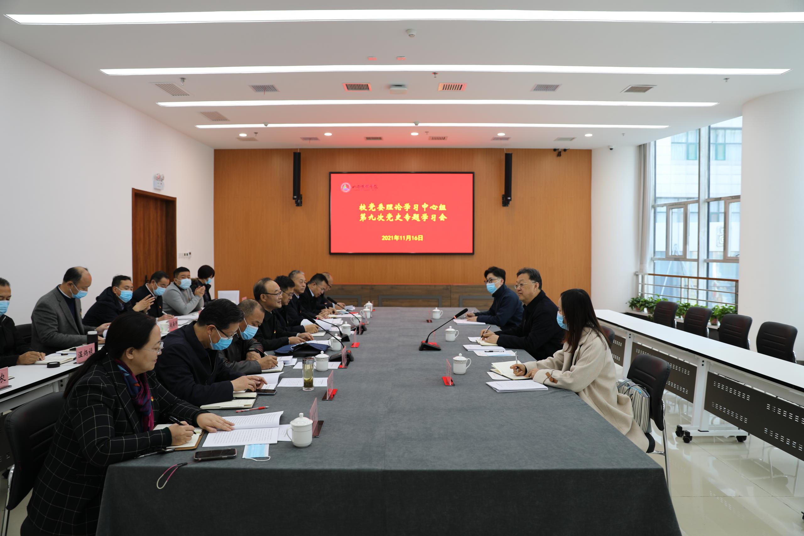 11月16日上午,校党委理论学习中心组举行第九次党史专题学习会,围绕学习党的十九届六中全会精神开展专题研讨。省委党史学习教育巡回指导组第十七组组长任月忠一行3人列席旁听了党史专题学习会。校党委理论学习中心组成员参加了学习会,会议由党委书记吴刚主持。