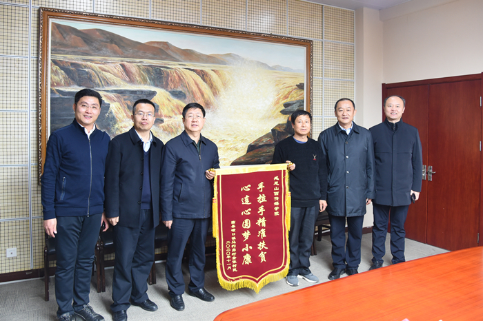 11月27日下午,我校帮扶的临县碛口镇马杓峁村支书薛廷贵,代表全体村民为学校送来锦旗。锦旗上的“手拉手精准扶贫,心连心圆梦小康”表达了全体村民对学校近三年的帮扶工作的感恩与致敬。党委书记王亦农接受锦旗,党委副书记刘锐、副院长郭卫东出席该活动。