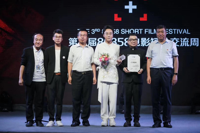 郭卫东与邢万里作为主办方代表为歌手李玉刚导演的短片《人约黄昏后》颁发“组委会大奖”。