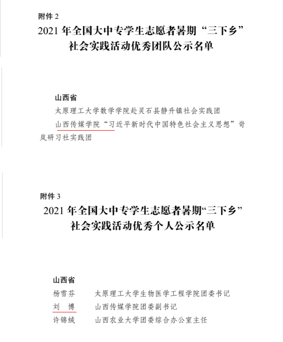 近日,2021年全国大中专学生志愿者暑期“三下乡”社会实践活动评选结果公布,我校“小我融入大我 青春献给祖国”党史学习教育暨暑期三下乡社会实践活动再获团中央表彰。“习近平新时代中国特色社会主义思想”岢岚研习社实践团入选国家级“社会实践优秀实践团队”,校团委副书记刘博获评全国“三下乡”社会实践优秀个人。