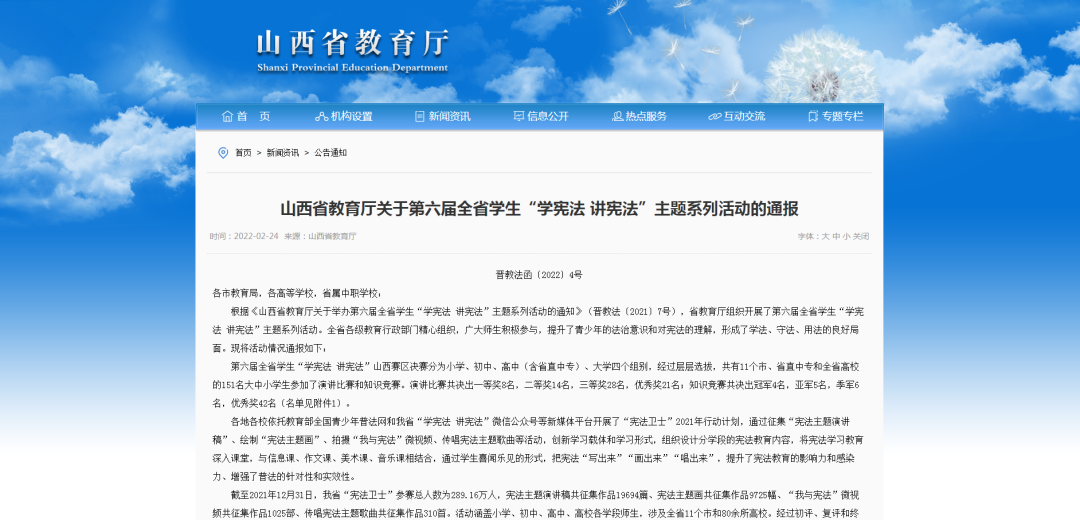 近日,山西省教育厅发布《山西省教育厅关于第六届全省学生“学宪法 讲宪法”主题系列活动的通报》,我校共荣获38个奖项,其中优秀组织奖2个、学生单项奖23个、优秀指导教师奖13个。