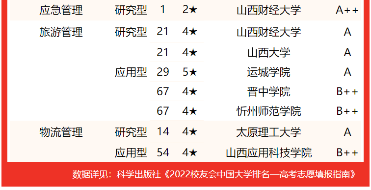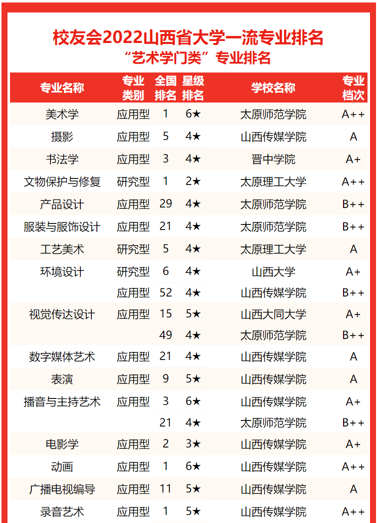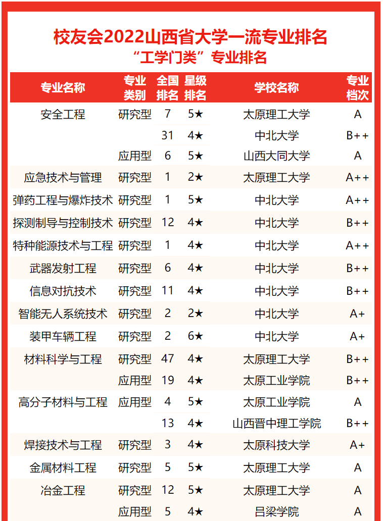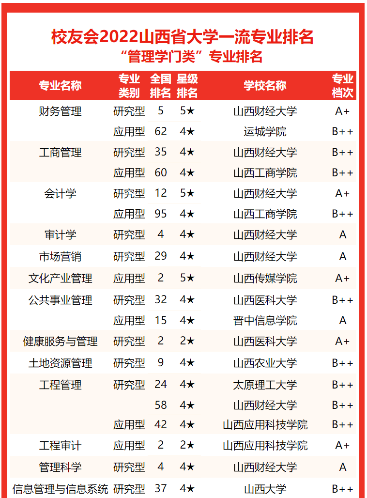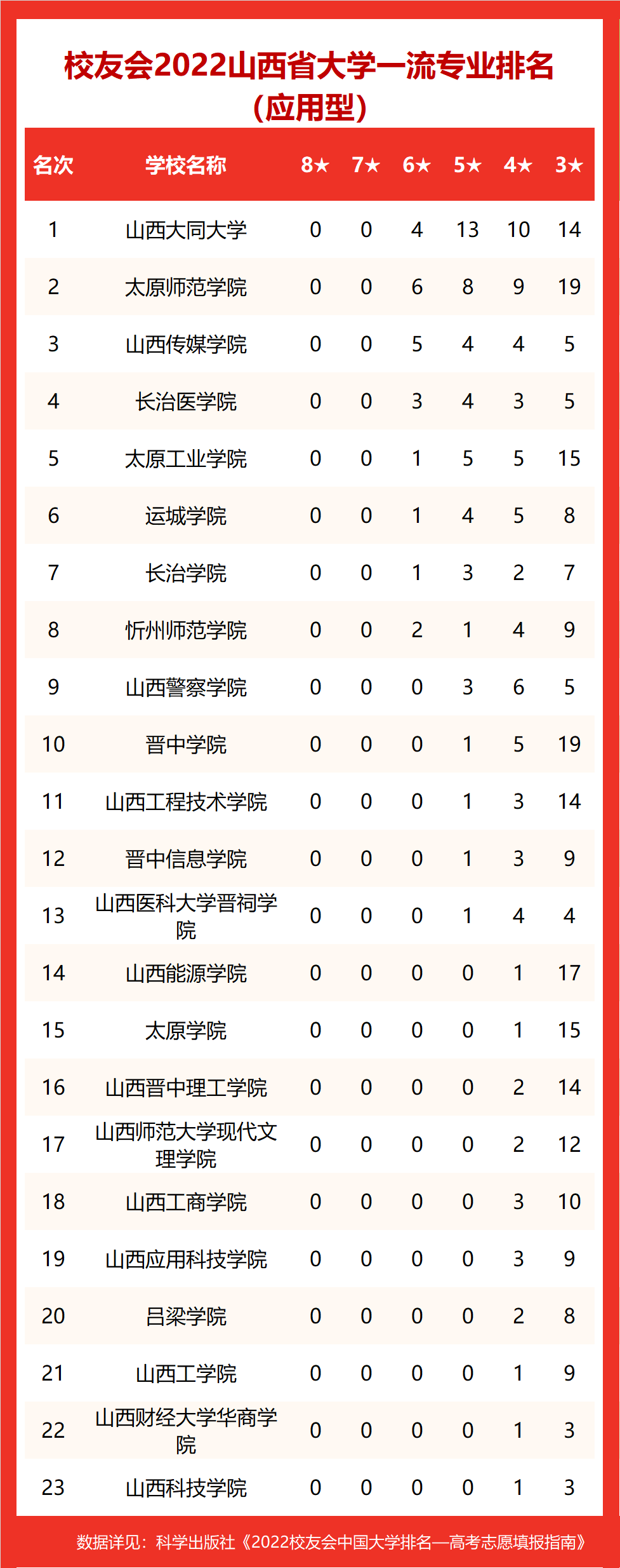 排名按照“研究型”和“应用型”对高校专业进行分类评价。榜单显示,我校位列校友会2022山西省大学一流专业排名(应用型)第3名,有5个六星级专业(6★),4个五星级专业(5★),4个四星级专业(4★),5个三星级专业(3★)。