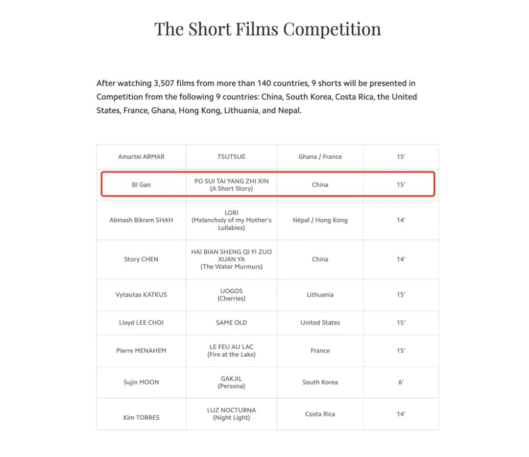 4月23日,第75届戛纳电影节短片竞赛单元公布入围名单。本届戛纳短片单元共有140个国家3507部作品参赛,最终入选9部作品,我校毕业生毕赣导演的短片新作《破碎太阳之心》位列其中。这是毕赣继《地球最后的夜晚》入围戛纳一种关注单元后再度入围戛纳电影节官方单元。