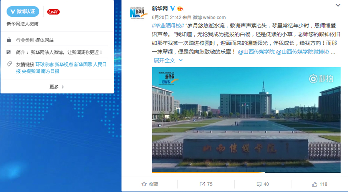 6月20日晚,新华网官方微博在“毕业晒母校”话题中刊播了我校毕业季宣传视频,据数据显示,截至目前,阅读量近22万次,播放量近64万次,播放量还在持续增加。6月21日,新华网山西频道在首页显著位置又以“毕业前,山西传媒学院学子们这样表白……”为题再次刊播此条视频,并同时推送新华网总网首页,得到广泛宣传。