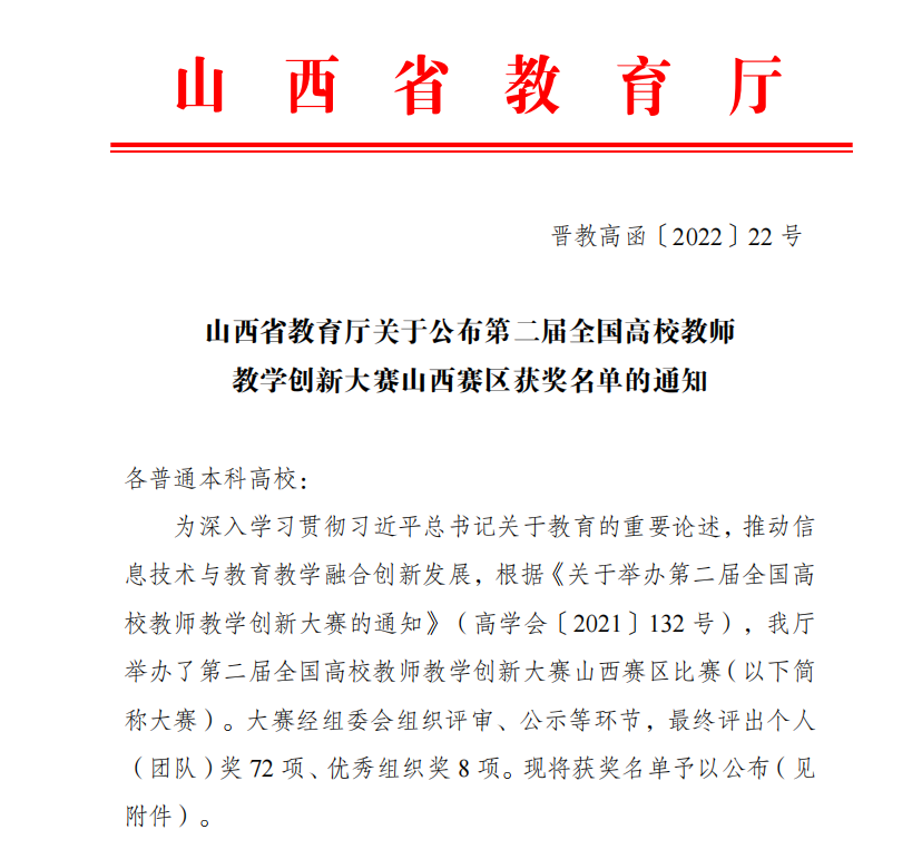 近日,山西省教育厅公布了第二届全国高校教师教学创新大赛山西赛区获奖名单(晋教高函〔2022〕22号),我校播音主持学院彭晓燕教授团队(团队成员:李卫峰)荣获山西省高校正高组二等奖。