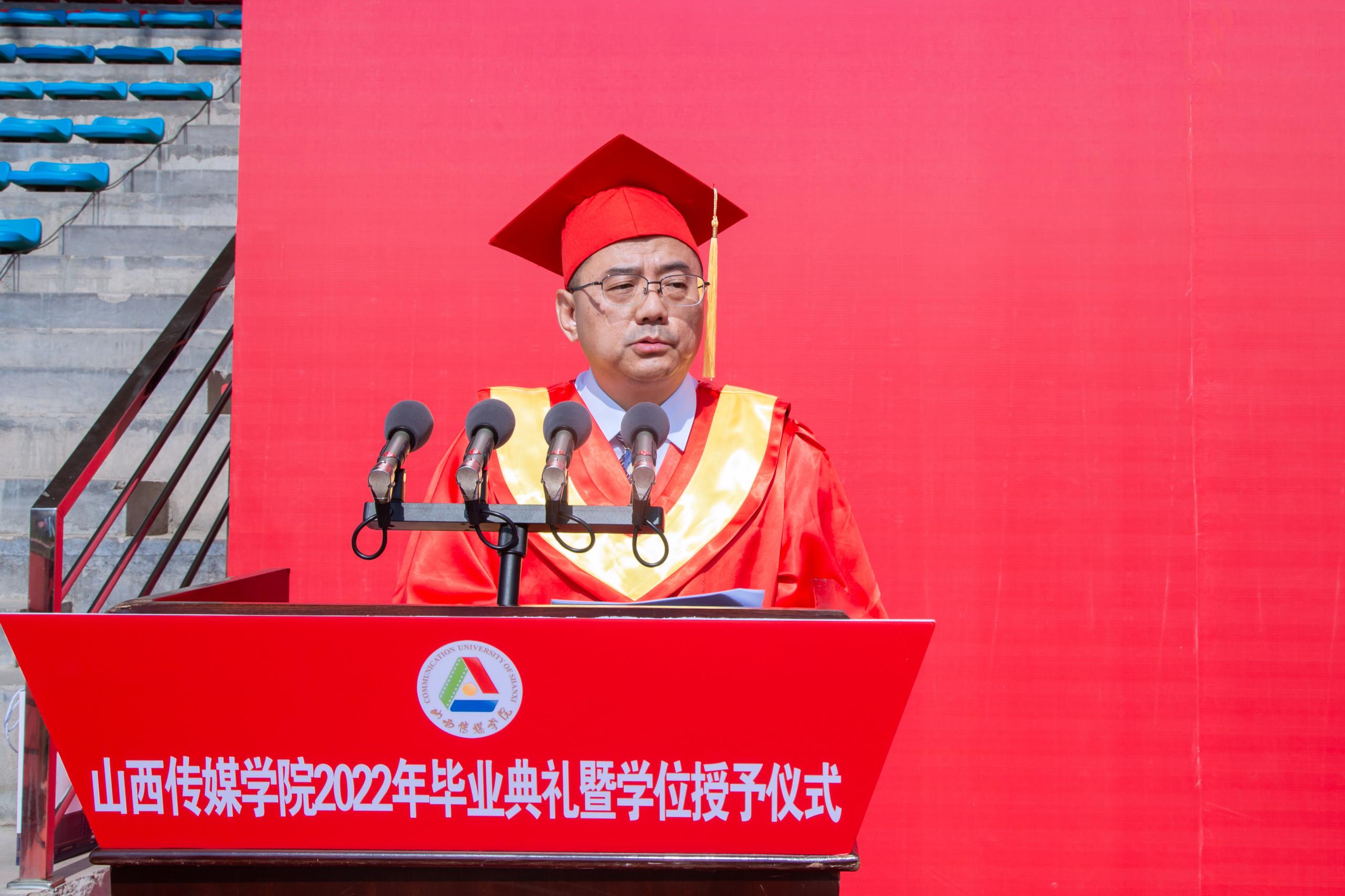 斗转星移,光阴似箭,四年弹指一挥间,又逢正冠拨穗日。6月28日上午,山西传媒学院2022年毕业典礼暨学位授予仪式以线上线下结合形式举行。校领导吴刚、李伟、刘锐、郭文平、郭卫东、庞亮及各二级学院院长出席典礼,学校相关职能部门负责人、各二级学院党总支书记、毕业班辅导员及全体在校毕业生参加。副校长王红叶主持典礼。