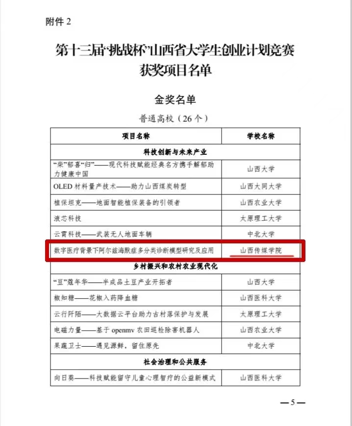 7月25日,山西省第十三届“挑战杯”大学生创业计划竞赛终审决赛落下帷幕。我校共入围10个项目,其中《数字医疗背景下阿尔兹海默症多分类诊断模型研究及应用》项目获得金奖,《智慧社区视域下的一站式互联网社区服务体系》等8个项目获得铜奖,校团委获优秀组织奖,获奖项目数量再创新高!