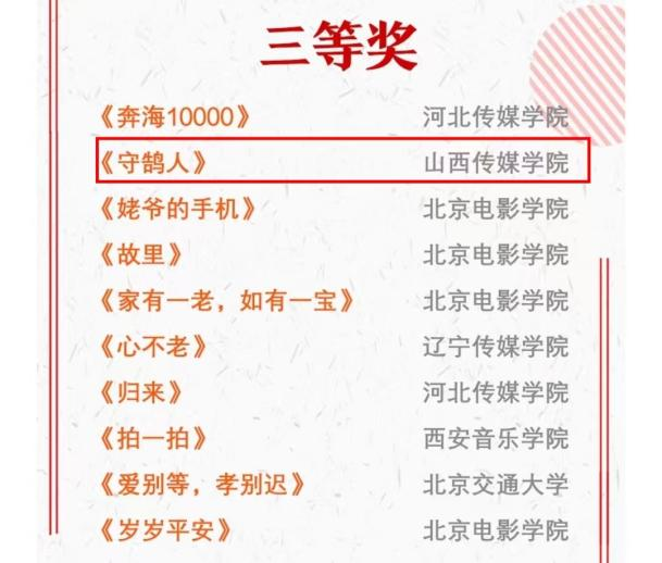10月10日,“爱在重阳·家国情浓”全国大学生网络视听作品征集活动公布获奖结果。我校获优秀组织奖,视听学院广播电视编导专业作品《守鹄人》获三等奖。
