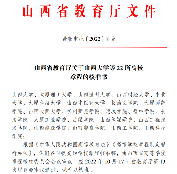 11月8日,省教育厅核准了《山西传媒学院章程核准稿》。