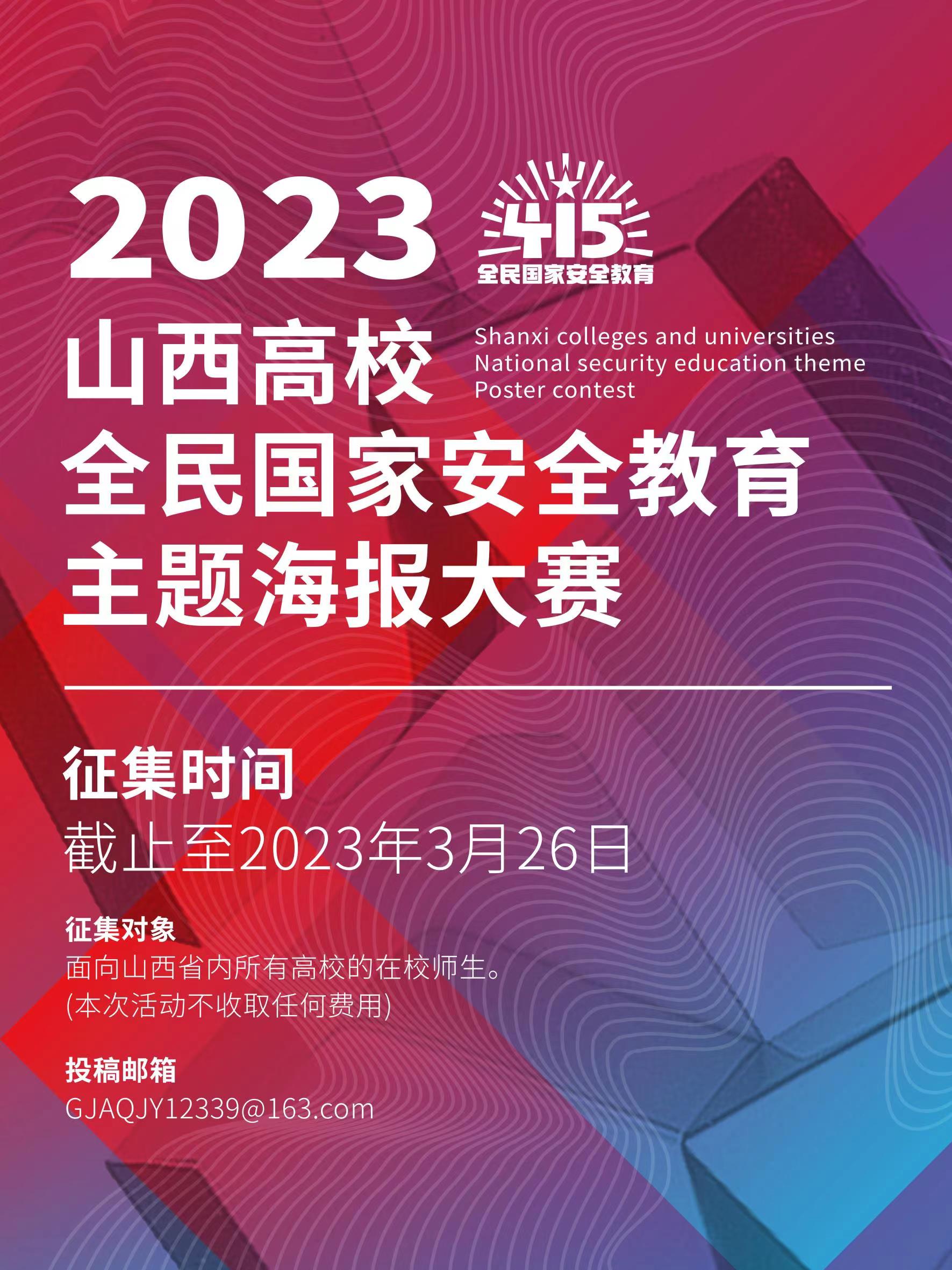 为深入做好第8个全民国家安全教育日宣传教育工作,推动国家安全教育进高校,树牢大学生的总体国家安全观意识,丰富高校创新能力培养和路径拓展形式,在全省高校营造国家安全人人有责的良好氛围,山西省教育厅委托山西传媒学院举办2023山西高校全民国家安全教育主题海报大赛。