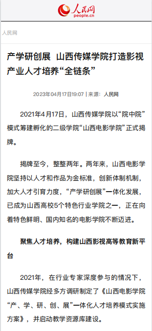2023年4月17日,是我校山西电影学院正式揭牌两周年,人民网对我校打造影视产业人才培养“全链条”进行了深度报道。