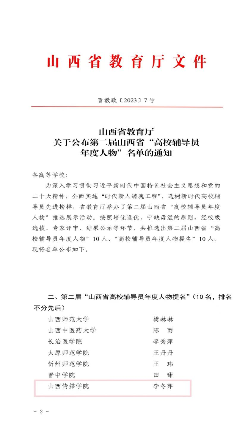 近日,山西省教育厅公布了第二届山西省“高校辅导员年度人物”评选结果,经学校推荐、材料审核、专家评审、结果公示等多个环节的角逐,共推选出第二届山西省“高校辅导员年度人物”10人、“高校辅导员年度人物提名”10人。我校艺术设计学院辅导员李冬萍荣获第二届山西省“高校辅导员年度人物提名”。
