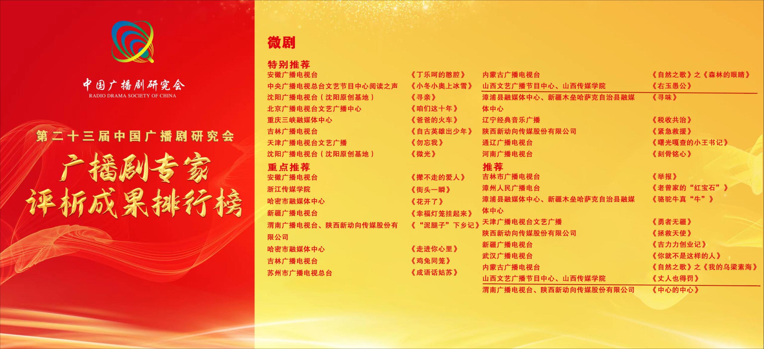 中国广播剧研究会年会是广播剧界一年一度的盛会,更是广播剧人相互学习、相互交流的平台。在此次全国广播剧专家评析活动中,山西文艺广播节目中心与我校首次联合选送广播剧作品参评,并从几十家国家级、省市级广电单位报送的数百件质量上乘的作品中脱颖而出,荣登专家评析成果微剧类重点推荐和推荐剧目排行榜。这一成绩可喜可贺,展现了我校在广播剧制作、广播剧人才培养方面取得的良好成绩。