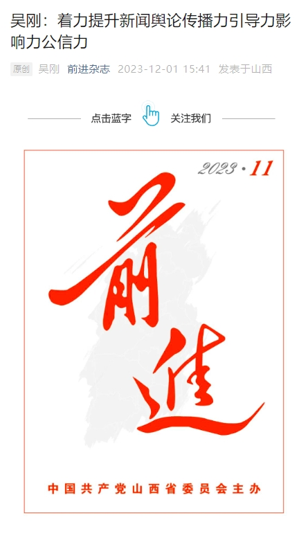 《前进》杂志于2023年第11期刊发了我校党委书记吴刚题为《着力提升新闻舆论传播力引导力影响力公信力》的署名文章,全文如下: