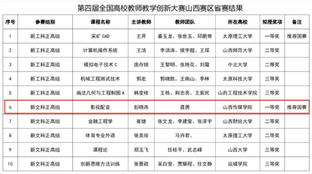 近日,第四届全国高校教师教学创新大赛山西赛区比赛结果公布,我校播音主持学院彭晓燕教授及团队荣获一等奖,刘嘉副教授及团队荣获二等奖,组委会推荐彭晓燕教授及团队参加国赛。这是我校教师团队首次被推荐参加此项赛事的国赛。