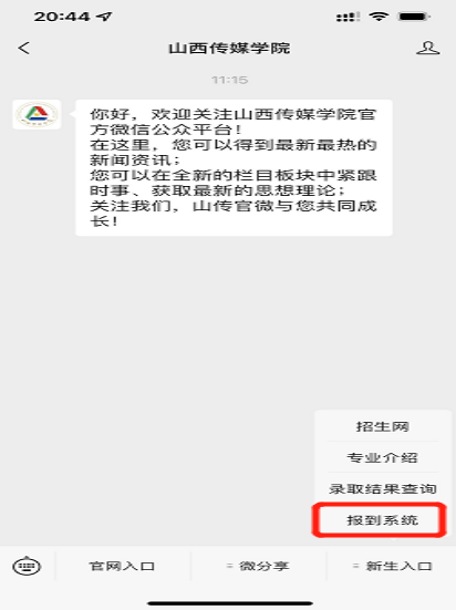 第1步用微信查找企业微信公众号【山西传媒学院】,找到新生入口中的【报到系统】。