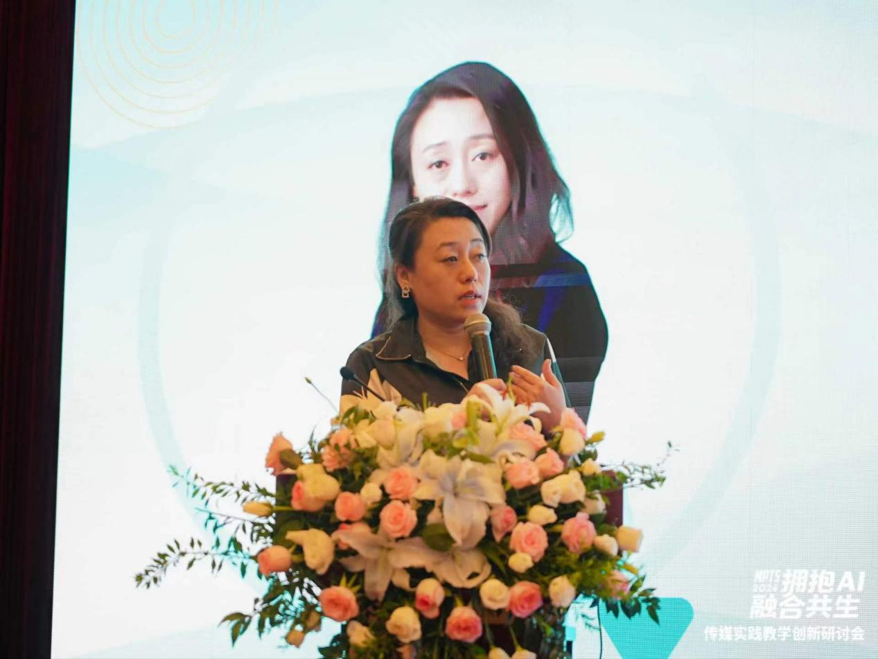 会上,贾月教授围绕《AI时代全媒体复合型视听人才培养模式的新思考》进行了主旨发言。发言重点围绕“应时代之变--走出去”“迎高校之变--请进来”“守初心不变--素养+”“创协同应变--课程+”四点展开。从改变观念与思维方式出发,指出了挖掘人工智能在影视教育领域的潜力的重要性,积极推动相关行业入校,结合影视补拍、内容创作、广告拍摄、文旅体验四个方式重构课堂内容。根据行业落地形式开设国家一流专业、卓越人才班、影视创作微专业三个试点课程更新培养方案。坚守实践教学模式的学院建设特色,组建了教授工作室、开设小学期集中实践教学、成立“光影随行”工作室等等提升教学效率、改善学习效果。并依托AI赋能,以“学”促“研”、以“研”融“创”、以“创”策“展”、以“展”托“产”进行“产”“教”融合,转变教学方法,为影视教育的发展注入新鲜活力,为中国式现代化建设贡献力量。