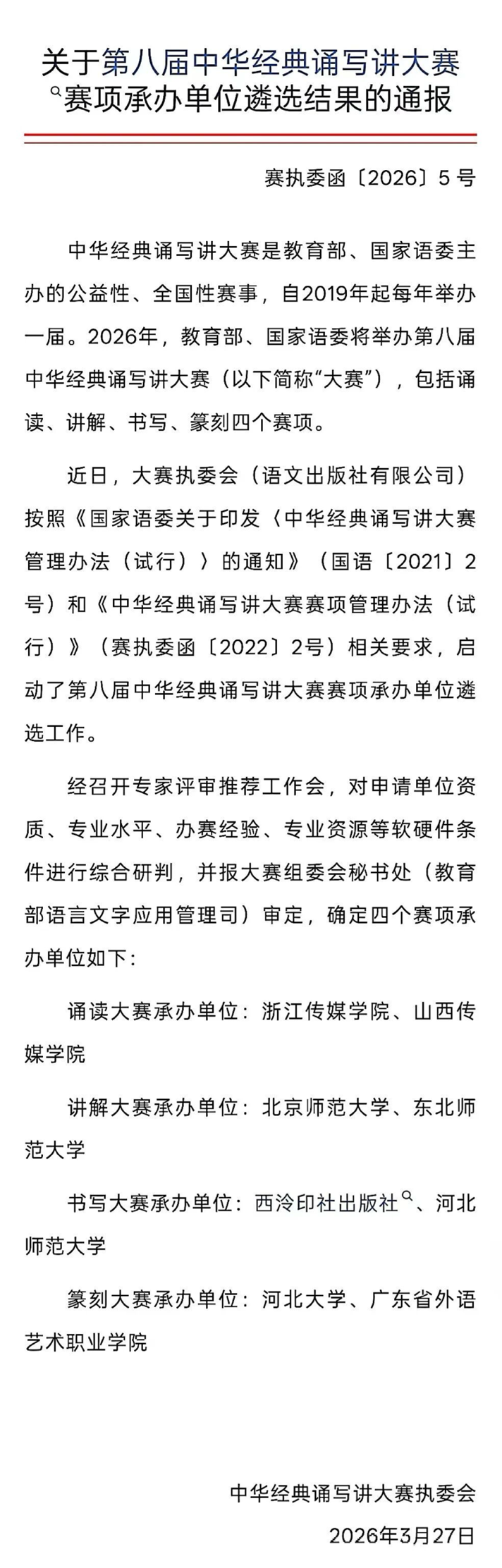 近日,中华经典诵写讲大赛执行委员会发布《关于第八届中华经典诵写讲大赛赛项承办单位遴选结果的通报》,我校成功入选第八届中华经典诵写讲大赛诵读赛项全国承办单位,将与浙江传媒学院共同承担该项国家级赛事的组织实施工作。这是我校在持续承办省级赛事基础上,首次入选该项国家级赛事承办单位,标志着学校在经典诵读赛事组织和专业办赛方面的能力得到进一步认可。